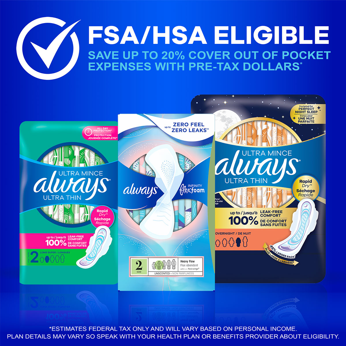 On your period, sudden gushes happen without any warning. But with Always Ultra Thin, you can now say “Goodbye” to stand up gush fears! All Always Ultra Thin Pads have our 3x Protection System to give you peace of mind day and night. RapidDRY technology absorbs gushes 2X faster than the leading store brand. The LeakGUARD core locks in leaks for long-lasting protection. Plus, OdorLOCK that helps prevent unwanted odors to help you feel fresh and clean throughout your day! Hello Clean and Comfortable! With Always Ultra Thin, Fear No Gush. Always Ultra Thin Pads come in a range of sizes from 1 to 5 to fit your flow and size perfectly. If you have a light flow or need a teen-sized pad, then we would recommend using our Always Ultra Thin size 1 to 3. If you have a heavy flow or want overnight protection, then we recommend using our size 4 or 5 Ultra Thin Pad. Additionally, all Always Ultra Thin packs are made of 50% recycled plastic. Remember that all Always Ultra Thin Pads are FSA & HSA eligible! Check with your FSA or HSA plan provider for information on the coverage of period care products.